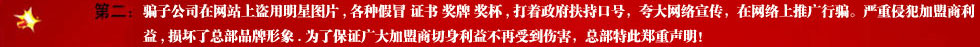 免費再開設(shè)分店(即第2個、第3個店),經(jīng)公司確認后,原簽定合同的代表人,需到公司辦理相關(guān)的分店免加盟費手續(xù)。 |