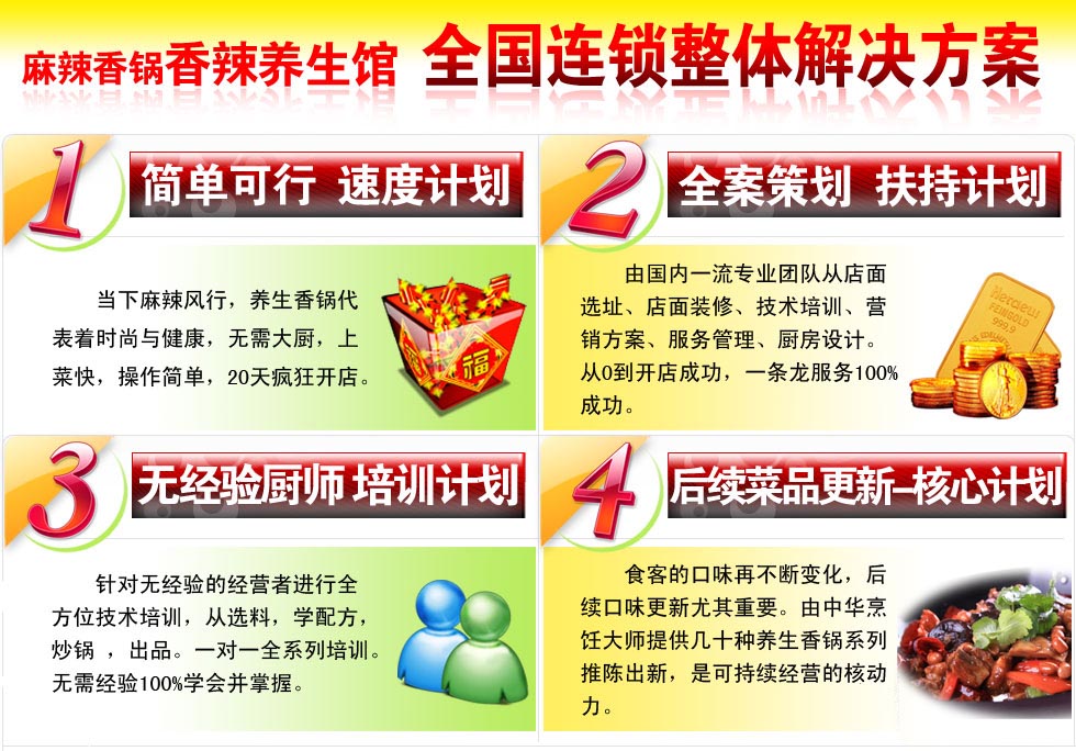 術(shù)培訓、整體形象設(shè)計、店面設(shè)計、開業(yè)指導、市場督導、個性化跟蹤服務(wù)、定期升級服務(wù)。 2.培訓內(nèi)容:麻辣香鍋極品鍋、麻辣香鍋精品鍋、麻辣香鍋滋補鍋、麻辣香鍋山珍菌鍋麻辣香鍋鴛鴦鍋