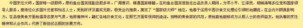 邀國(guó)家特級(jí)名廚熊敦勝先生,出任正宗重慶烤魚技術(shù)總監(jiān),全責(zé)正宗重慶烤魚風(fēng)味烤魚、特色名菜、特色名吃等系列美食的技術(shù)升級(jí)及配方研制。